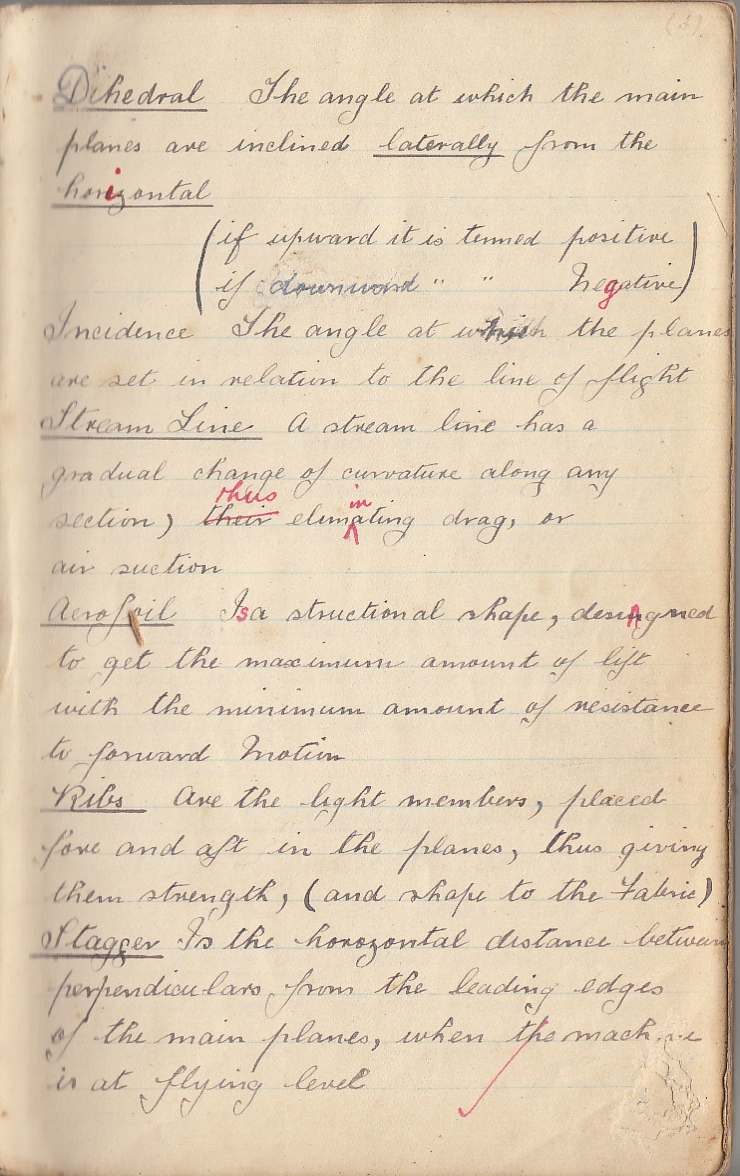 The notebook is very neatly produced, the text and drawings in ink, with the instructors corrections in red.