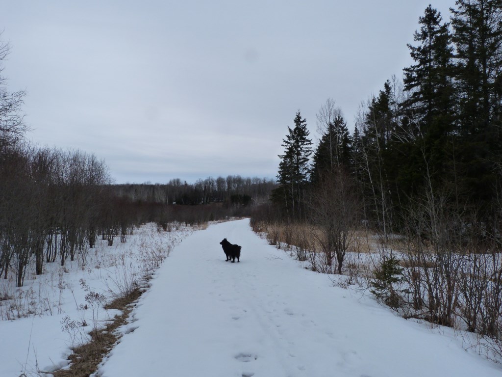 April 21st - Mandy inspects the snow covered laneway to the field.