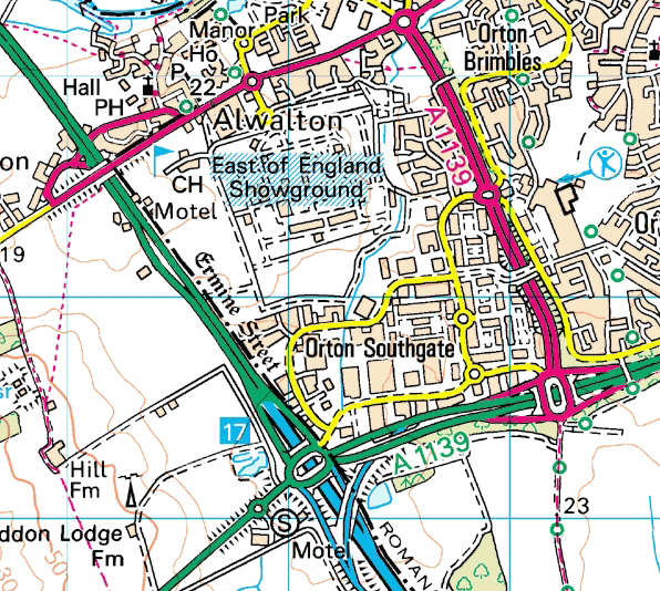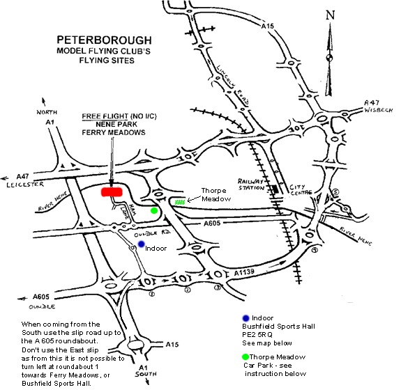 Thorpe Meadows - see the Nene Park Trust map. The flying site, intended solely for control line flying, is a small triangle of green bounded on the south (ish) side by the rowing and canoeing course, the north side by Longthorpe parkway (A1179), and on the east by the Nene parkway (A 1260). Access to the area is via the car park marked at Orton Mere (it's actually at the end of Osler Lake), walking over the Nene valley railway and the foot bridge over the R. Nene, thence a right and under the Nene parkway, following the path around to the left, and the flying area is on your right. It's a good couple of hundred meters from the car park and worth having a set of wheels if you're hauling a lot of kit. Access to the car park is from the Oundle road. (A605)