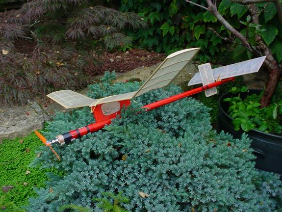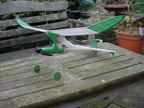 Construction : 1/32” rolled balsa fuz, built up flying surfaces with CF stiffeners