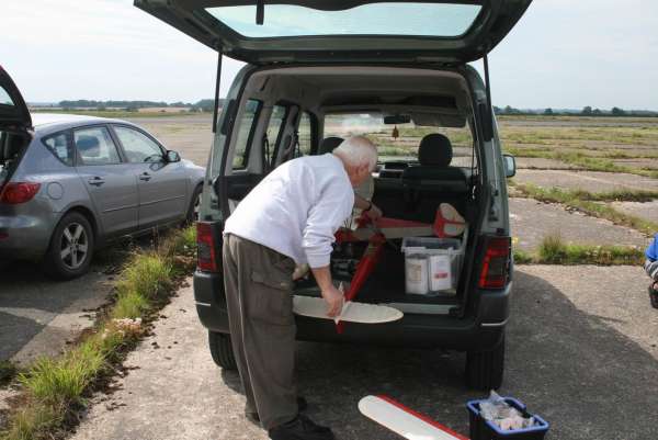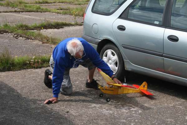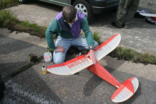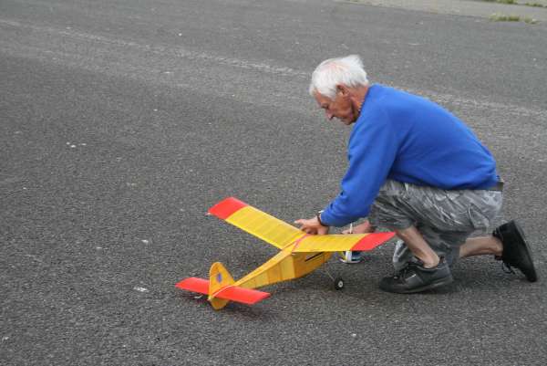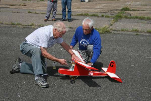 The Sculthorpe Bowden 22nd July 2012 Click for photographs. Well at least it was not raining but the wind speed picked up during the day to be 8-15mph at 11.00, start time for the Bowden. The entry was slim with 4 fellows from the Peterborough club and last years winner Mick Staples. John Ashmole opened the proceedings with a > 60sec overfly caused by 'a recalcitrant screw in his timer faceplate' . This could be a metaphor for 'I did not set the timer'. Will we give him the doubt, I wonder, or will he get a BVW timer mess up T-shirt at the AGM? Time will tell. John's 2nd flight was 'formidable' good long take off run, excellent climb out, spot on turn radius, imperceptible transition and a long glide. Dave Rumball's Tomboy was defeated on both flights by the high windspeed and with a Mills that did not want to peak out. Bernie Nichols Trenton/Frog 100 ran well but first flight was out of trim with the model turning tightly on a wing tip. Second flight was also iffy with of all things a power stall and a just acceptable 30sec flight time. Nonetheless, Bernie was the only flyer to score on both flights and accordingly won the contest taking the Stan Horne memorial shield. Mick Staples, last years winner was unlucky in having a short motor run and was given a DNQ having failed to make 30sec. Second flight was much better with a stable 39sec effort. Peter Adams Sky Gypsy provided the greatest entertainment with half the flight being at less than 10feet off the ground. Alas a short flight DNQ prevented Peter from placing.