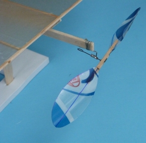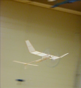 Christian Moes from the Soo Modellers, Ontario, Canada was taken by the Gyminnie Cricket and on December 15th 2012 flew his version and sent us photos and a video and said:- "We had our last indoor session for 2012 yesterday, and in addition to the wide range of RC types present, it was also an opportunity to test fly my new Gyminnie Cricket. This is quite possibly the first flight of a Gyminnie Cricket in Canada - and maybe even, this side of the pond! It came out at 5 grams (less rubber) and is shown flying here on a 14" loop of 1/8" tan rubber. The video shows it's 4th test flight - and remarkably, it flew right off the board - with no trim adjustments whatsoever. Could use a little downthrust maybe? Prop bearing is copper tubing soldered to piano wire. Prop is 17mm diameter with basswood hub and thin plastic blades from Tim Hortons takeaway Cappuccino cup. Condenser tissue covering."