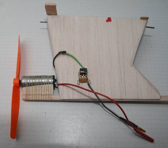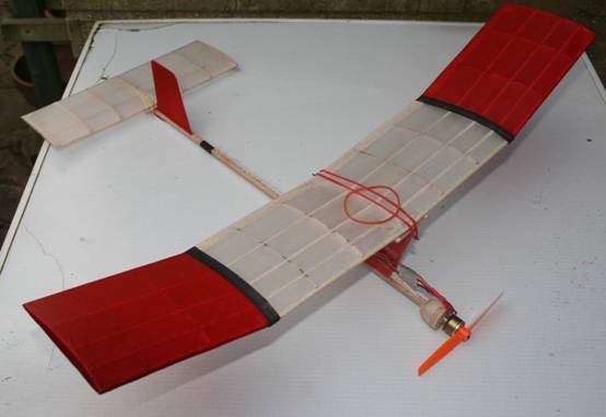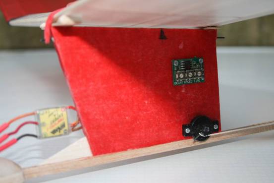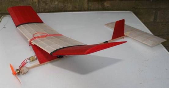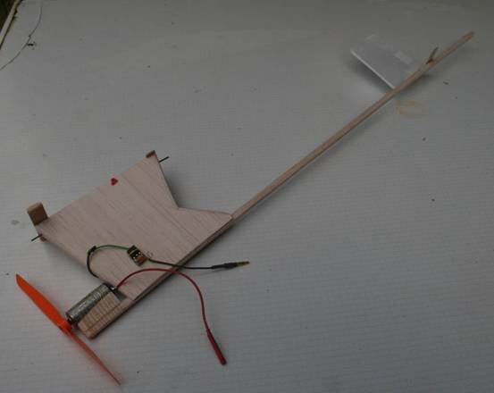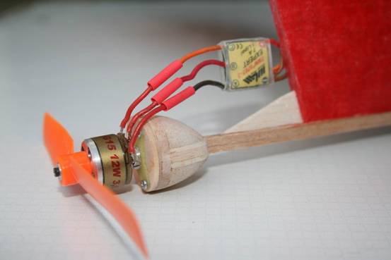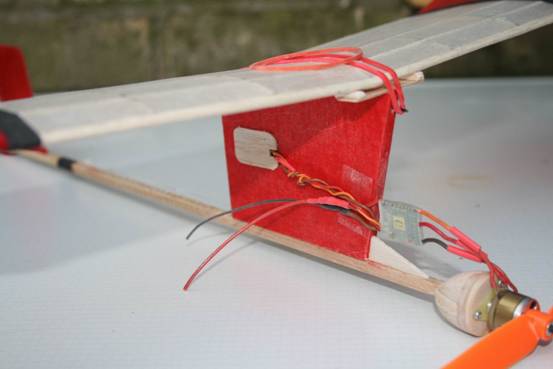 7-10sec motor run. This is too much of a handicap. A good alternative to the Gasparin Bronco that I have used is the Robotbirds 5gm motor 409407 kv 3000 rev/min/volt. Suppliers data gives 4 amps at 13600 rev/min on a GWS 5 x 3. But you must use a 2 cell LiPo, a 25C capable 180mah battery would be recommended 405624. This will weigh 13.6gms and can be teamed with a 6gm 6 amp ESC 400210. The complete power unit with connectors, conductors , ESC, motor , mount and battery would top 30gms but would deliver 96gms of thrust allegedly. The only controller to use would be the kpaero. Some pictures of the nearly completed model (as yet unflown)