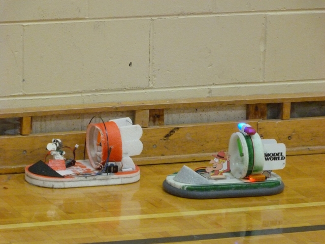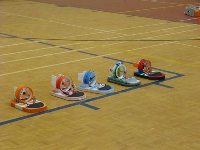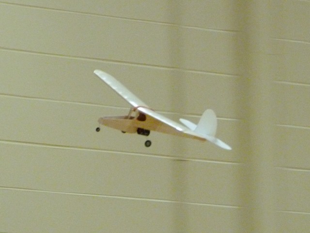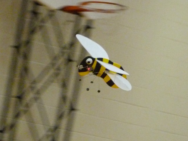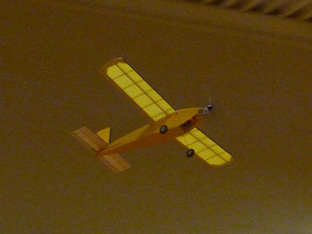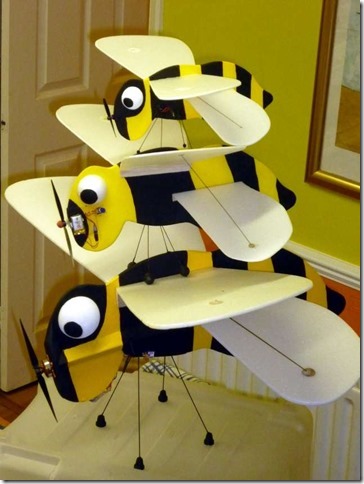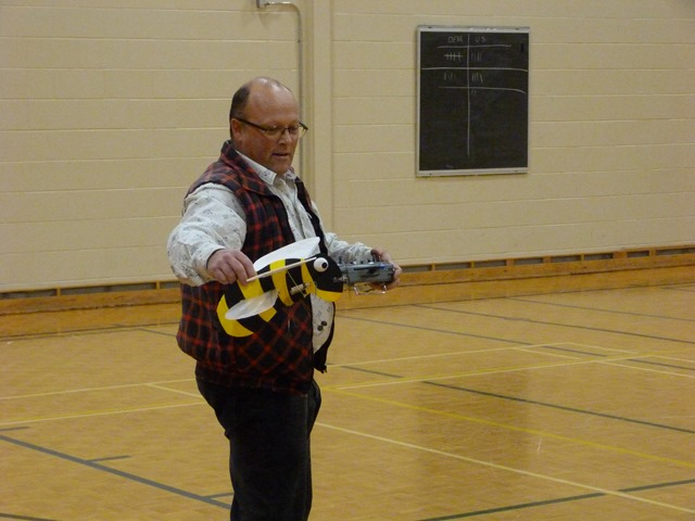 A touch noisy for indoors - click for the YouTube video From the 23rd Nov edition My "Bee" also made it's first flights in the gym this week - well sort of. So far, it appears to have neither stability nor control... and seems underpowered as well. Not a good start, but will be back again next week with some design changes. After several attempts, it did make a full circuit after all, and is certainly eye-catching. Some have suggested that it's actually a bumblebee - behaving in a scale manner and clearly demonstrating the well known scientific theory that bumblebees can't fly. No... I did not dream up the "bee" on my own... and accept no responsibility whatsoever for the design! It is the product of some devious minds over in the UK - this photo courtesy of the PMFC website: