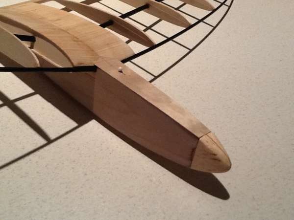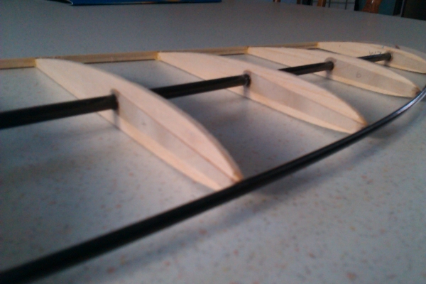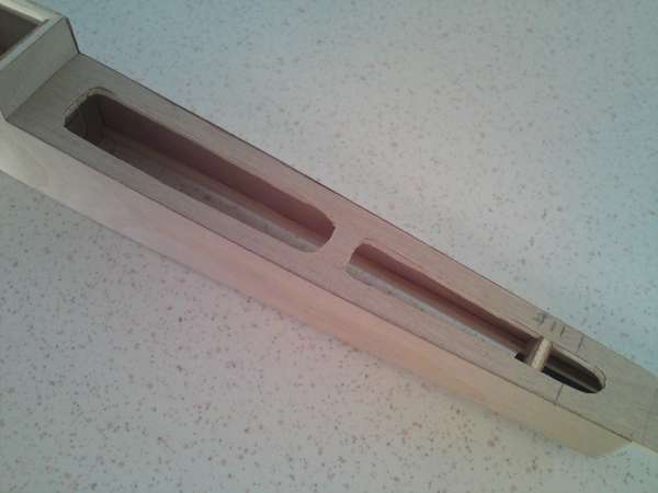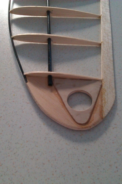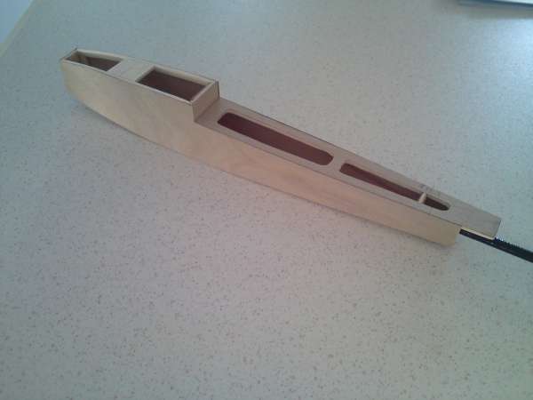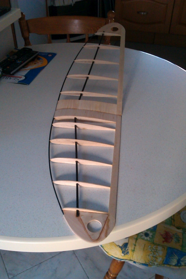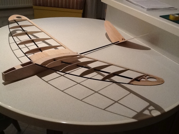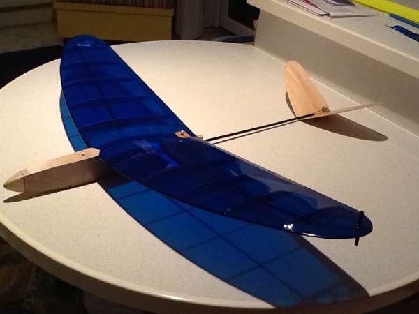 The PSS is based on the Bug scaled up to 960mm, the leading edge is the second section from a fishing rod and the main spar is the third section, the wingtip is strengthened with .5mm ply to carry the throwing peg (still needs more lightening holes) I have also put some strips of .5mm ply onto the ribs to take the load of the leading edge. Finished a/w covering and battery, I have used one section of the fishing rod for the fuselage boom, it's a bit bendy so I might have to change it later, just couldn't resist trying it to see what happens! The fuse is made from .4mm plywood and 3/32" sheet laminates for the formers and wing deck, turned out quite light and solid. Radio Orange RX " 2 off Turnigy servos Weight so far 129gms. The wing is fitted with anylon bolt at the TE and a dowel retainer at the front, control rods are thin piano wire push pull and I found a section from a different fishing rod that is much stiffer, Hey Ho we shall see. The most expensive piece so far is the .4mm ply! I missed my 150gm target, the finished model with 3cell Nicad came out at 173 gms, this includes 3gm tip weight to balance the wing and counteract ply strengthening and launching peg. It didn't need any extra weight to obtain C of G. The tail boom worries me!! There was some general discussion as to which Pound Shops stocked the fishing rods. Dave said he got his from the Pound Shop, opposite Westgate House, on Park Road, whilst they weren't in stock at the Bretton branch, or the one in Melton Mowbray, come to that.