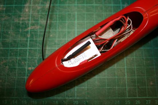 epoxied to the floor of the pod. These were mounted in line. The elevator servo