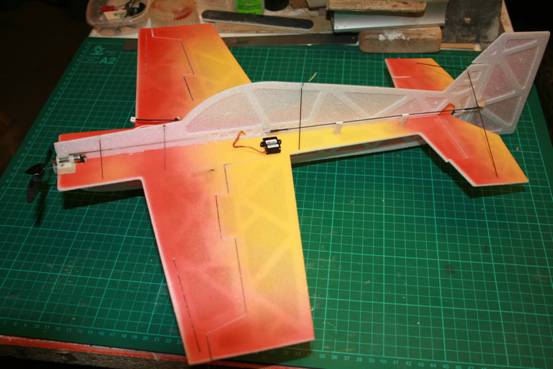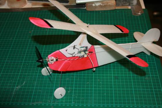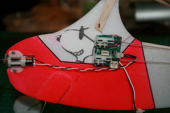 The motor is a brushed, geared Parkzone 8mm from a P51D. AUW is about 45gms. The Shockie : A conventional Shockie is 7-800mm span with a 30-50 Watt brushless motor weighing about 80-120gm. This would not be user friendly in a hall shared with FF peanuts and RC Embers. The micromodeldrome shockie is a mere 350mm and was built with a 2 servo wing so that the ailerons could be drooped for super slow flight. AUW is just less than 40gm.