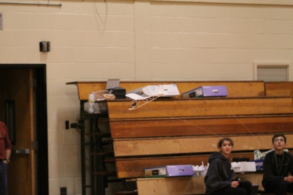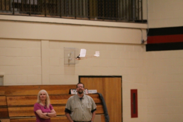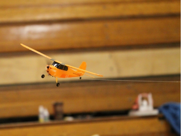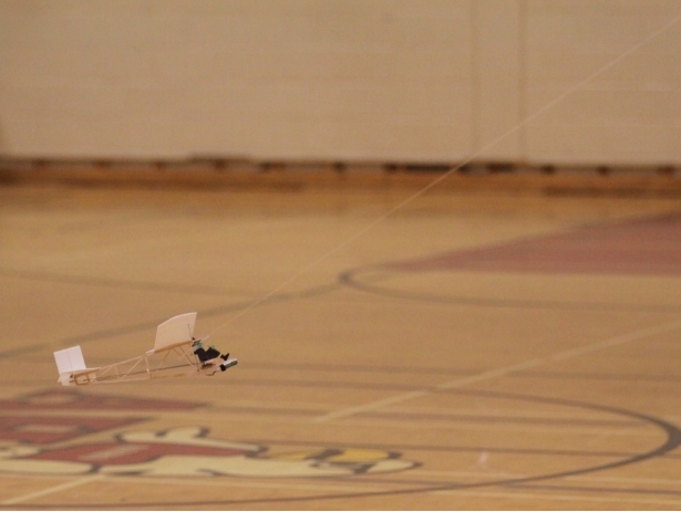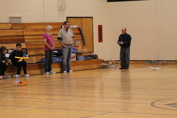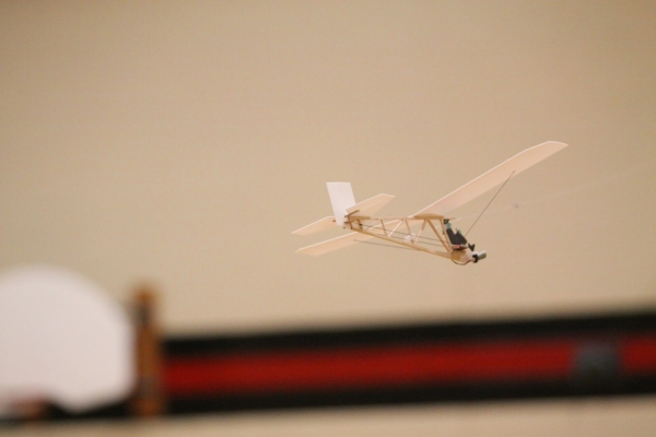 Indoor program started last Saturday (18th). Latest indoor pics on website - but have attached original size photos by Peter Smith, above and below if you want to use them on your site. We did lots of glider towing here on the island this summer - and Tom and I were keen to try it in the gym! We didn't have a proper glider towhook release - this first trial being a "feasibility" test. That said... there is barely enough room for a Flyzone Champ to negotiate within the four walls of our gym - but with a glider 'in tow' and swinging to the outside of the turn? I think you get the picture! The glider is 'almost' scale Northrup Primary Glider. With a stick balsa fuselage and 1mm Depron flying surfaces, it performs quite well on it's own, thank you - without the nasty towline attached! Note the towline "totally out of shape" in the last photo! All great fun of course, and neither plane was damaged, but next time we are going to attempt a piggyback launch of some sort...