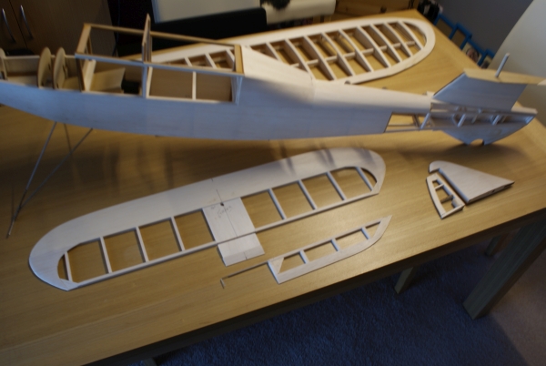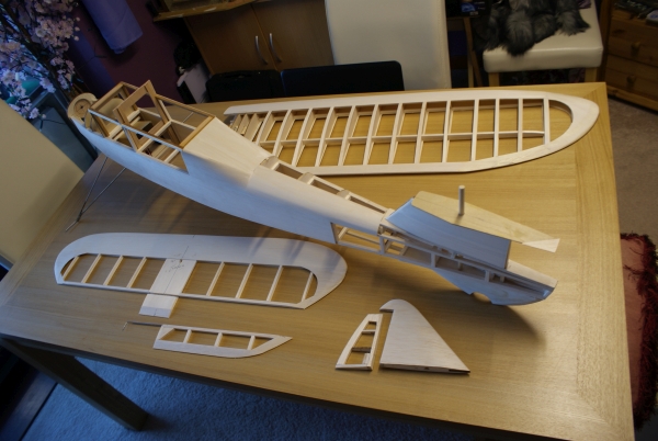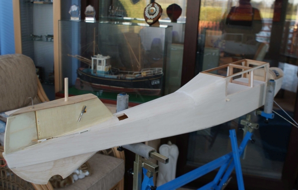 Oh, why don't I plan things properly before I start building? So, there it is part one completed, at the end of November. Next entry, end of December. Or, if you hear nothing, it's all gone pear-shaped. Look in sometime, to find out! Of course, if I WERE an engineer, ex or otherwise, I would have thought through the potential problems before starting out, rather than going at the basic construction pell mell and expecting everything to turn out right at the end, which only happens in Theatrical Performances. The issue of drive to the elevators was easily solved by mounting a mini servo in the lower part of the fin; quite a good idea for larger models, which I shall probably use again. More serious was the realisation that permanently mounting the wing centre to the fuselage would require a degree of reinforcement of the cabin area that would risk changing the character of the design. So, rubber bands it would be. It's a long time since I've touched down a tip on landing, but a ground loop could cause it to happen, and the twisting motion may rip apart a lightly built cabin. Somehow, this months' tasks just seemed to take much longer that expected. Photographs will show little change, but the fitting of all systems, hatches, motor and sheet covering just dragged on. This is what we Rugger Types call the hard yards. Lots of work for little obvious result, yet the final outcome relies upon effort and accuracy at this stage. However, it is the last day of the second month, and I am still on target.