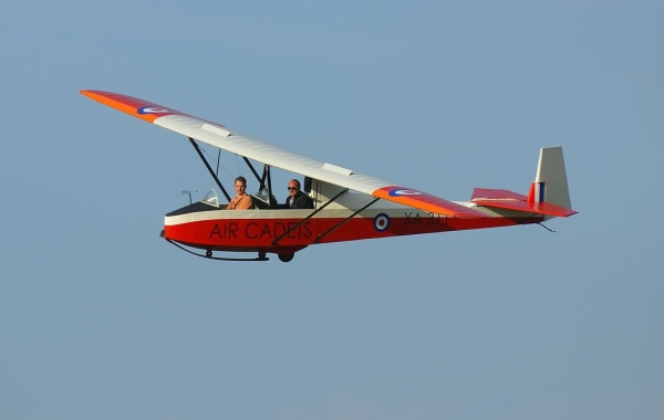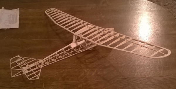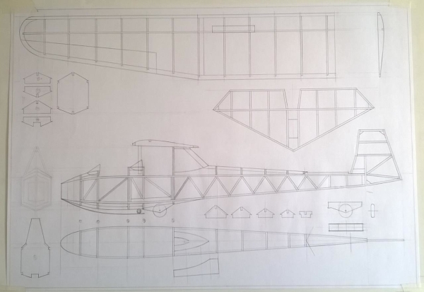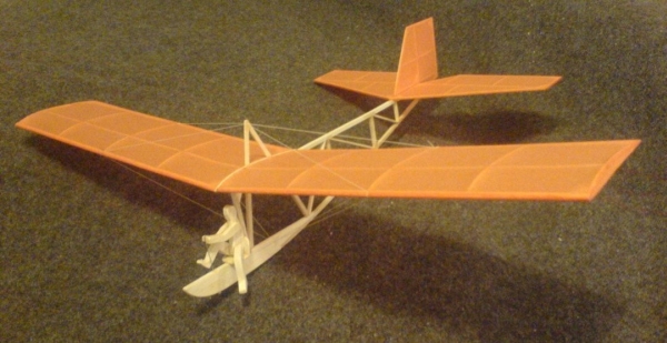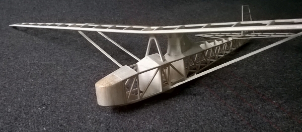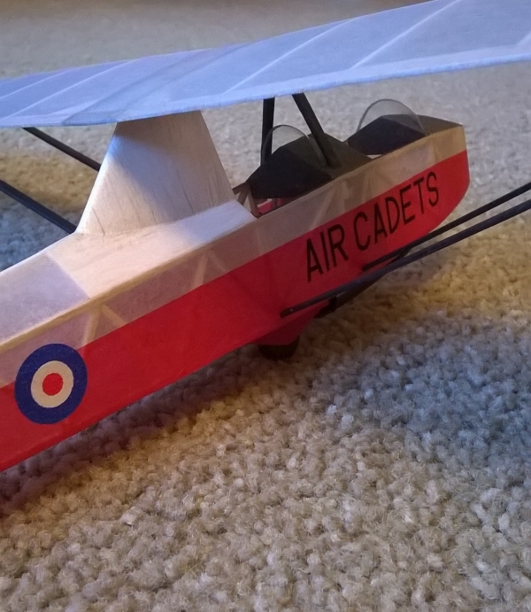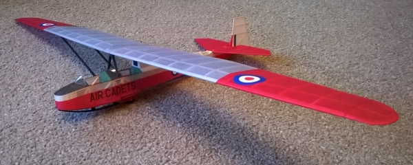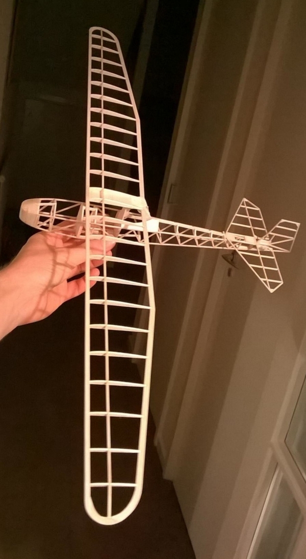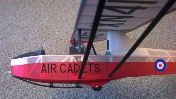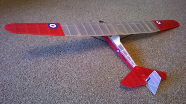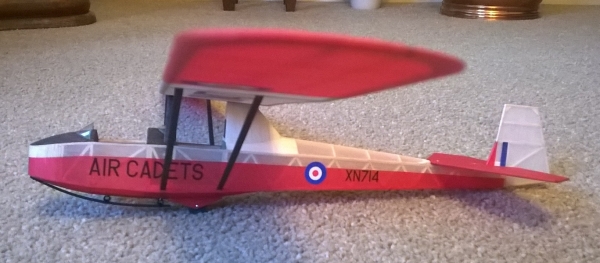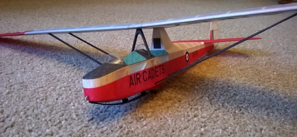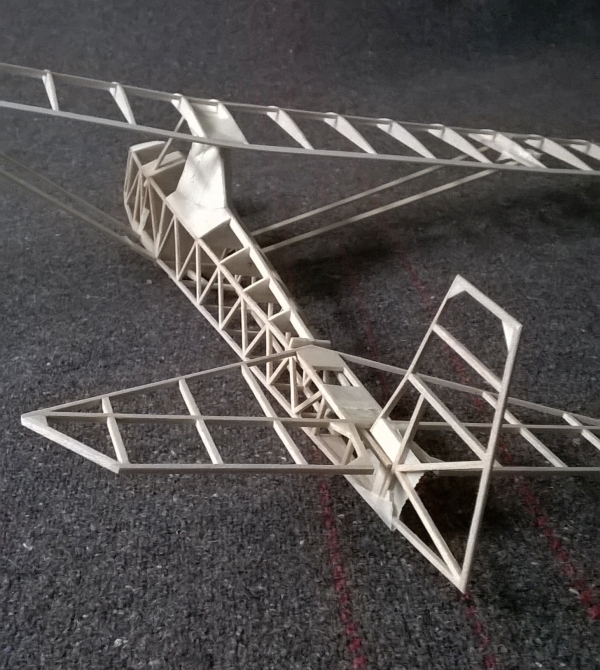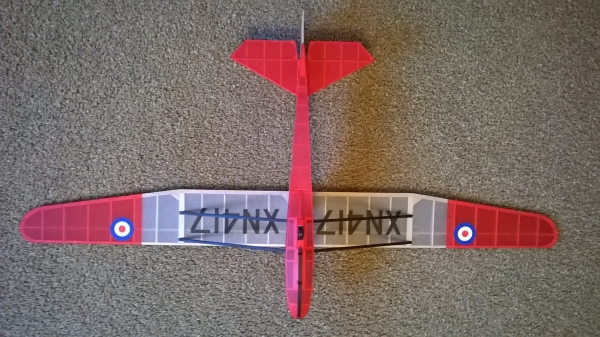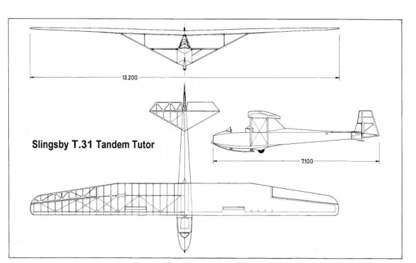 The Slingsby T.31 Tandem Tutor is my own design at a scale of 1:20. This gives a wingspan of 26 inches. The design is fairly conventional and was not intended to be a superlight model. Rather, I was after a sensible entry into the class and a fairly quick build and a simple tissue finish. I wanted to see if I could trim a model with minimum dihedral and small tail surfaces. The original aircraft has no dihedral but I gave the model 2.5 degrees. The tailplane is slightly enlarged but has a modest tail volume of 0.45. My weight target (based on a 'cube loading' of 2) was 15.8g. The finished model weighed 14g but with noseweight ended up at 17g.