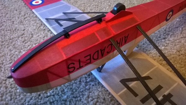 The structure of the fuselage closely follows the fullsize. The model has survived a few head-ons with the wall at Bushfield and has proved sturdy. The struts are all balsa covered with tissue and give plenty of rigidity. Tailplane incidence adjustments are possible as it is just pushed onto two small dowels. The tissue covering is mostly red and white esaki, the 'trainer grey' of the wings was colour printed. The markings are a combination of printed and cut tissue lettering. The wheel and skid are both functional, the 'doughnut' suspension has a little give. The skid is laminated from 1/62 ply. The wheel is turned from balsa with an aluminium hub and pin axle. First flights with the Tutor were made at Bushfield in January. My initial thinking was to use rudder to give a turn and oppose this with 'aileron to keep the wing up' as you might with a rubber model. The Tutor had other ideas however - it just flew along crabwise! So I ended up ignoring the rudder and setting the turn with an aileron trim tab. This was an important lesson for me: with the high aspect wing and minimum dihedral, roll control was far more important than rudder control. The model proved to be spirally stable but it does lose some height before levelling out.