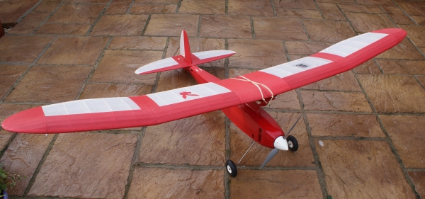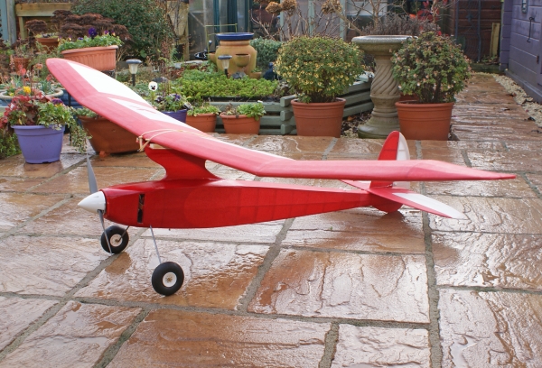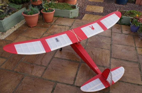 Things are not as they seem. This is no gentle floater. Imagine a Formula One racing car: rip off the wheels and wings and what have you got? A missile aiming at the horizon. Do the same to Joe Elgin's 1939 design, and you have a rocket, but with a powerful motor on the front, ready to fire at the clouds. The intention is that this will be aimed at that slight dark hollow at the base of a passing Cumulus with the steepest climb that I can manage. Or, perhaps, I shall be able to produce that kind of vertical barrel roll that we see from a well trimmed Slow Open Power job. Only then does it change character and wind itself into the thermal while I reach for the coffee and sandwiches. When the plan arrived, in two parts, I initially thought that I had been sent a mismatch: the wing looked too large for that little fuselage. A quick check proved that the plans were correct, the wing really is that big. As for the nose job: traditionally Playboys appear before the public with a large diesel bolted onto the front former, right underneath the leading edge. That looks and sounds good. In my case, however, having eschewed diesels (no prejudice, just laziness) I have an outrunner powered by a three cell LiPo in the same location; but since a spinning can is not as aesthetic as a polished four stroke, I have extended the bodywork forward to cover it. It doesn't prevent me from updating the motor, adding a gearbox, or even a folding propellor at a later stage should I wish. In this way, the model is a larger companion to my Lanzo Bomber which also appears on this website. Balancing the finished job was a problem; it needed ballast (I'd rather not say how much) crammed into a very small space. If only we could find something that's heavier than lead. First solution was to add a pair of large, very heavy wheels, but that made the model look like Bambi in boots, or Shirley Bassey on the Morecambe and Wise show. I could not sit in my workshop (which doubles as reading and music room) and contemplate such an ugly creation hanging on the wall. So, a neater pair of wheels (streamlined Williams Bros would be best, but that's £20 more on the outlay...perhaps next year.) Now, here's an idea: remove the 1/4 sheeting around the nose and replace it with sheet lead, with a plasterer's skim of balsa on the outside. Remember that the nose structure is not, er, structural as the motor is rear mounted. The air intake under the nose was a happy accident which just sort of happened while I was sanding down the block balsa, and the gills at the sides allow access to the motor mounting as well as an escape for hot air. Covering is Polyester and heavy Esaki, both from Woodhouse. There are no snags in the building, I have split the wing into two parts with wire joiners, but the wing mount is strengthened, epoxied and screwed, in order to accept G-forces off the top of the climb. Power is a three cell LiPo, Waypoint E-3026-12 (at present) turning an APC 14 x 7.