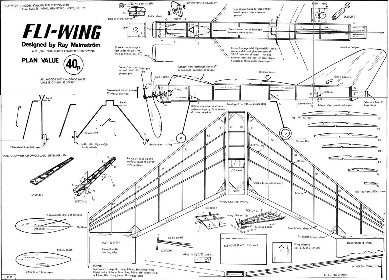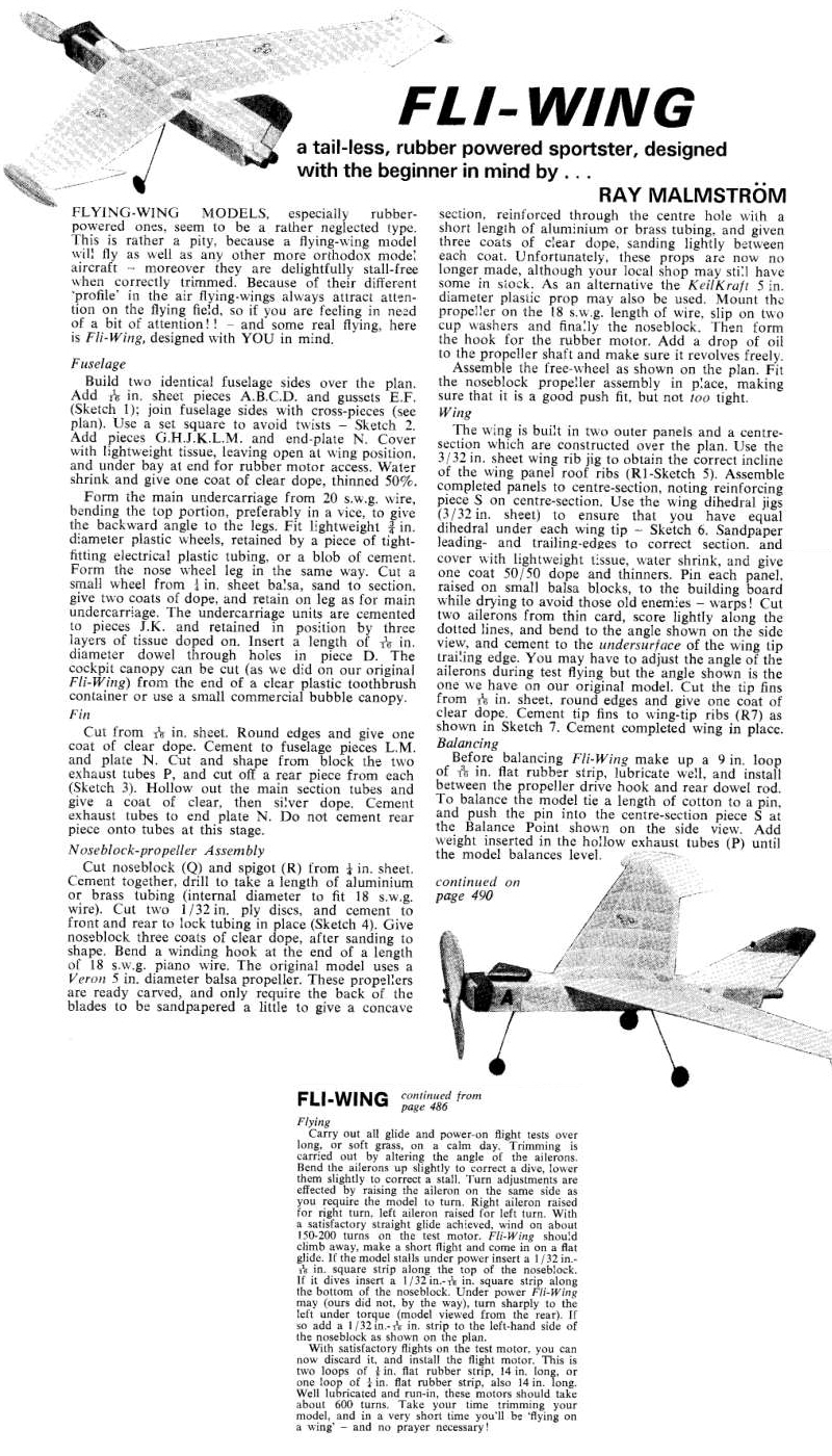 look:- Sams Models have:- G5031 Mystery Tailless. Based on a design by Roger F. Parkhill of the Air Corps Technical School. Originally published in Flying Aces magazine, April, 1940. Kit includes CAD drawn rolled plans, precision laser cut parts, hand-picked balsa, FAI rubber motor, Peck propeller and nose bearing, and Easy Built Lite silver tissue. Also includes new Tissuecal (trademarked), a printed tissue, like decals but much lighter. 22" wingspan. £25.95 Ray Malmstrom produced a free plan for the Aeromodeller called