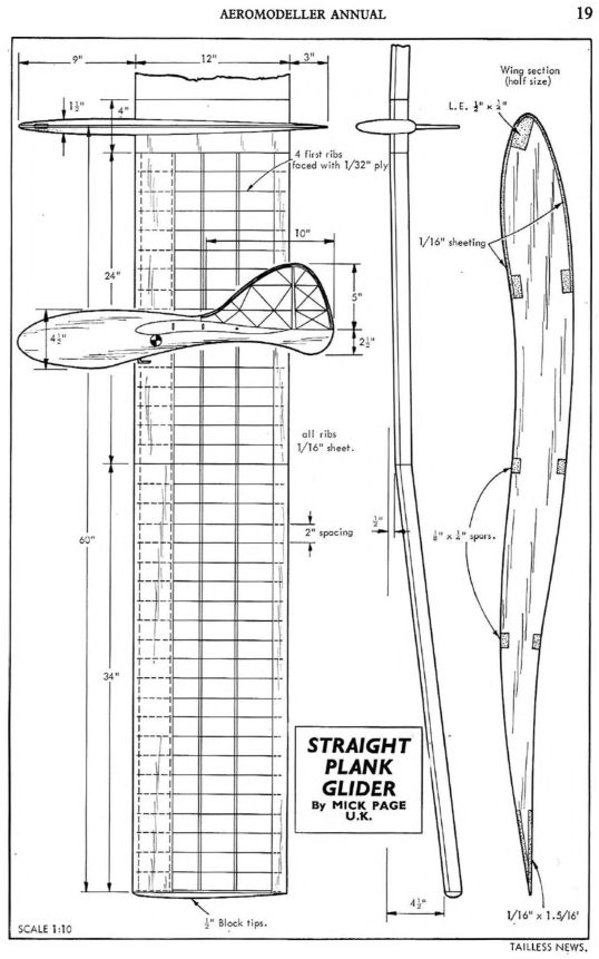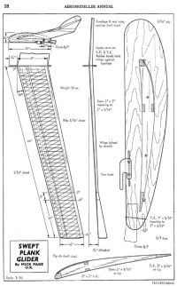 Plank Gliders designed by Mick Page In the December 2018 edition of Aeromodeller there was an article "Particular Planks" where Mick Page's Straight Plank Glider got a mention. This led me to RCBookcase, where, amongst lots of good things, there are scans of Aeromodeller Annuals, both text and covers. On pages 18 and 19 of the 1969-70 annual are the following.