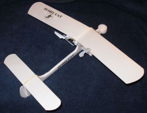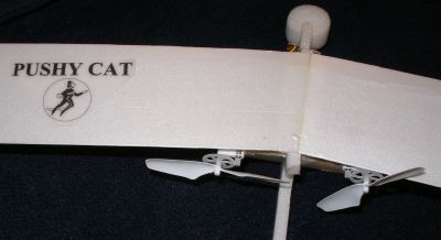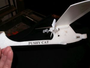 I was a keen builder of Vic Smeed designs back in the '50s, one I didn't try was his 1953 Bowden winner Pushy Cat. As a pusher, a scaled down version seemed a possible to be powered by one of these motors. Turned out that my 33cm span depron version was just a touch too much for a single motor but a pair, attached to a "motor bar" did the job. It has a sensible flying speed and reaches the Bushfield ceiling in about 45 seconds. In the spot landing competition I overdid the "zap" I gave the Peterborough timer and had a flight of over a minute with several bounces off the ceiling, this seemed to do no harm and it landed closest to the prize. I was delighted to win and the general feeling was I would have to abandon depron and make a scale model to suit the quality wheels.