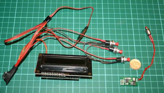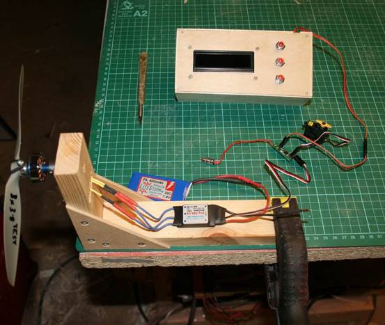 The programming unit, now mounted in a ply/balsa box and plugged to the controller board, in a test set up consisting of :- Robotbirds 1800kv 20gm outrunner