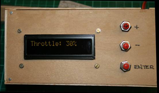 running an APC SF 8 x 3.8 propeller The 3 buttons, top to bottom, provide increment, decrement and enter functions. Spot the airborne controller tiny ain't it? Testing : Plug the programming lead into the controller and connect the battery. The display shows a welcome screen then a supply voltage and then you get