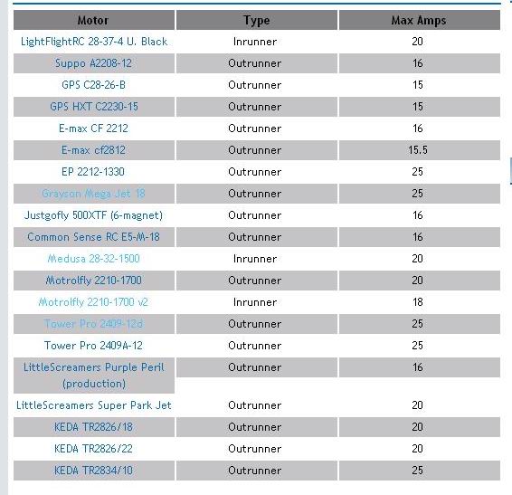 Knowing the current draw, you can spec the ESC as current x 120% and spec the battery using 10C for FF and 15C for RC. Please ignore manufacturers 65C claims. I have tested batteries to a 3.0v/cell cut off and it very rare that any battery exceeds 20C safely and for any appreciable time. Overlander and Hyperion are the best I have used. What more could you possibly want? Some of these motors might be hard to find but you will know what you are looking for wrt kv, diameter, length and energy consumption and you can contact your favourite supplier. Ian Middlemiss Nov