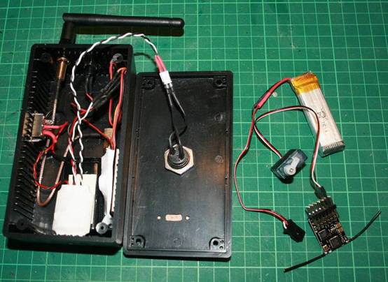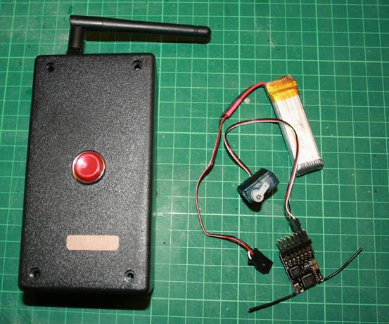 that might do the job, the idea of a homebrew caught the imagination. The BMFA Free Flight Rule Book para 3.1.1 suggests.....'that a single transmission for the purposes of DT is allowed for free flight models. The rules disallow transmission on 27/35/40MHz and recommends use of the 2.4GHz frequency'. A 2.4Ghz Futaba RF module was procured (£30) together with a Phil Green encoder (£10) which supplies the relevant servo signal. An enclosure, a push button switch, an on/off power switch and a 9v pp3 completes the TX components and half an hour with a soldering iron hooks everything up. The airborne system is a Lemon DSM2 2.4Ghz receiver (£8) powered by a 50mah LiPo . This drives a 1.8gm nano servo via a mouse trap. The airborne system weighs 6-7 gm and is shown below. The battery shown is 120mah 1s and was replaced by a 50 mah 1s for flight testing.