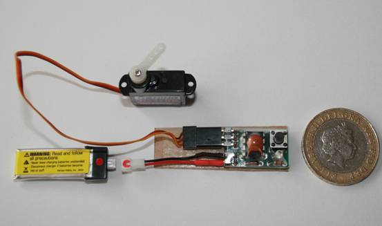 Total weight ready to fly would be 9.8gm. The LiPo is overlarge and a 35mah (1.4gm) would probably be OK. Similarly the servo was what was hanging about in the spares box and a 2gm lightweight would work. Potentially a DT flying weight of around 6gm would be possible. Flight Mode : Plug the battery and the DT goes into boot mode, a blue LED gives a fast pulse in 'glimmer' mode with a reduced intensity. Nothing at all happens until you hit the push button PB (top right). The DT timer starts, the LED pulses at 1 sec intervals and runs for the time you have set. The servo moves to full travel. On retrieval, hit the button again and the servo reinitalises to its original position with LED in 'glimmer'. Re-programming : Plug the battery as above and get to 'glimmer'. Hold the PB down for 3-4 sec until the LED extinguishes. Release the PB and press once for 10s, twice for 20s , three times for 30s DT and so on to a maximum of 30 presses or 300s. When you have finished this, the chip will return you to 'glimmer'. I have been running chip based electronic systems for 18 months using cheap servos in HLG's. There have been many lawn dart arrivals and I have not suffered any servo failures. In conclusion, Dens Timer is a light, compact, inexpensive alternative to the classic clockwork timer. It should find favour for both sport and competition disciplines. Ian Middlemiss May 2016 contact@peterboroughmfc.org |