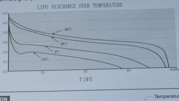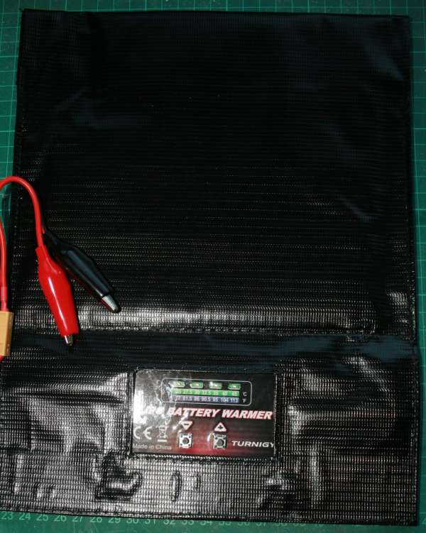 LiPo Warmer I made up a LiPo warmer from bits and pieces early in the year and used it at the Nats 2016 in E30. The model climbed away very well and that was the last time I saw it. I noticed that Hobby King were marketing a LiPo warmer and I bought one as it was a better design than my own effort. Basically an insulated bag with micro controlled temperature , set using + or - buttons. Powered by a 12v or 3s LiPo battery. The attached graph shows the effect of ambient temperature on battery voltage. There are two reasons why you should think about LiPo warming. The first is competitive advantage in electric FF disciplines, the second is for RC in preventing the battery voltage dropping below 3.0v/cell and destroying the battery and worst case, the model. Note that the X scale of the graph infers a very conservative discharge rate. In practice an electric soarer would have current discharge rates 50 times higher. The 3.0 v/cell limit would creep up on the unwary with consummate speed. Ian Middlemiss