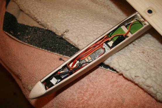 I finished the wing with 3 coats of B and Q exterior satin polyurethane rubbed down between coats. With little attempt at weight saving, the RTF weight came out at 360gms with no added nose weight. AVIONICS:The RU/EL servos were cheap EMAX ES08 but I had to use a expensive spare X08 for the spoiler as the fuselage width is only a mere 22mm wide under the wing. This was a fiddly job using a 0.38mm piano wire push rod. The RX is an MPX RX5 M-link with an MPX altimeter driven by a 300mah 2s LiPo and a Zepsus magnetic switch with a 5v BEC regulator.