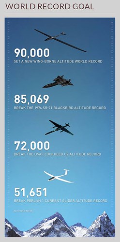 The aim of the Perlan 2 project is to ride the polar vortex mountain waves up into the stratosphere. Using the upward moving part of this wave system to climb, gliders can ascend as high as 10km up to the top of the troposphere where the cold air of the mountain wave encounters warmer air at the boundary with the stratosphere and cannot rise further. However, during the 1990s, NASA test pilot, Einar Enevoldson and Dr Elizabeth Austin discovered that in sub-polar regions in winter, mountain waves could extend beyond the troposphere and well into the stratosphere. This is because of high altitude winds which exist at the outer boundary of the polar vortex in winter known as the stratospheric polar night jet which can exceed 260kt. In conditions where the stratospheric polar night jet aligns with the lower-level jet stream over mountains, it can create winds which increase with altitude through the tropopause and upward to 100,000ft creating stratospheric mountain waves which ascend way beyond normal mountain waves. Given that such waves exist, would it be possible to use them to take a glider up to heights previously thought impossible? To discover the answer, the Perlan project was created. History World record goal height chart. (Perlan Project) Over six years Enevoldson collected evidence on the location, prevalence, and strength of stratospheric mountain waves. From 1998 the data analysis was expanded by Dr Austin and the significance was realised of the stratospheric polar night jet in propagating high altitude standing mountain waves. Meanwhile, researchers at the NASA Dryden Flight Research Center were looking at the flight dynamics and aerodynamics of sailplane flight up to 100,000ft. In 1999 air adventurer Steve Fossett heard that Enevoldson was seeking funding to build a glider to test the concept of riding stratospheric mountain waves and asked to join the project. The Perlan 1 glider was created using a modified Glaser-Dirks DG-500 motorised glider with the engine equipment replaced by liquid oxygen tanks and Li-SO2 batteries. The glider was also fitted with faceplate heat controllers, high altitude stabilised parachutes and full pressure suits loaned from the US Air Force . The name Perlan, which means pearl in Icelandic, was chosen for the project after the pearlescent nacreous clouds that appear in the uncharted winter polar stratosphere. Perlan 1. (Seattle
